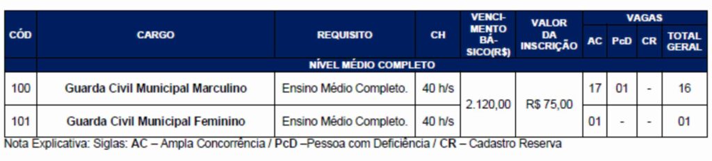Para o cargo de Guarda Civil Municipal, a prova será aplicada no dia 02 de maio, no período da tarde.