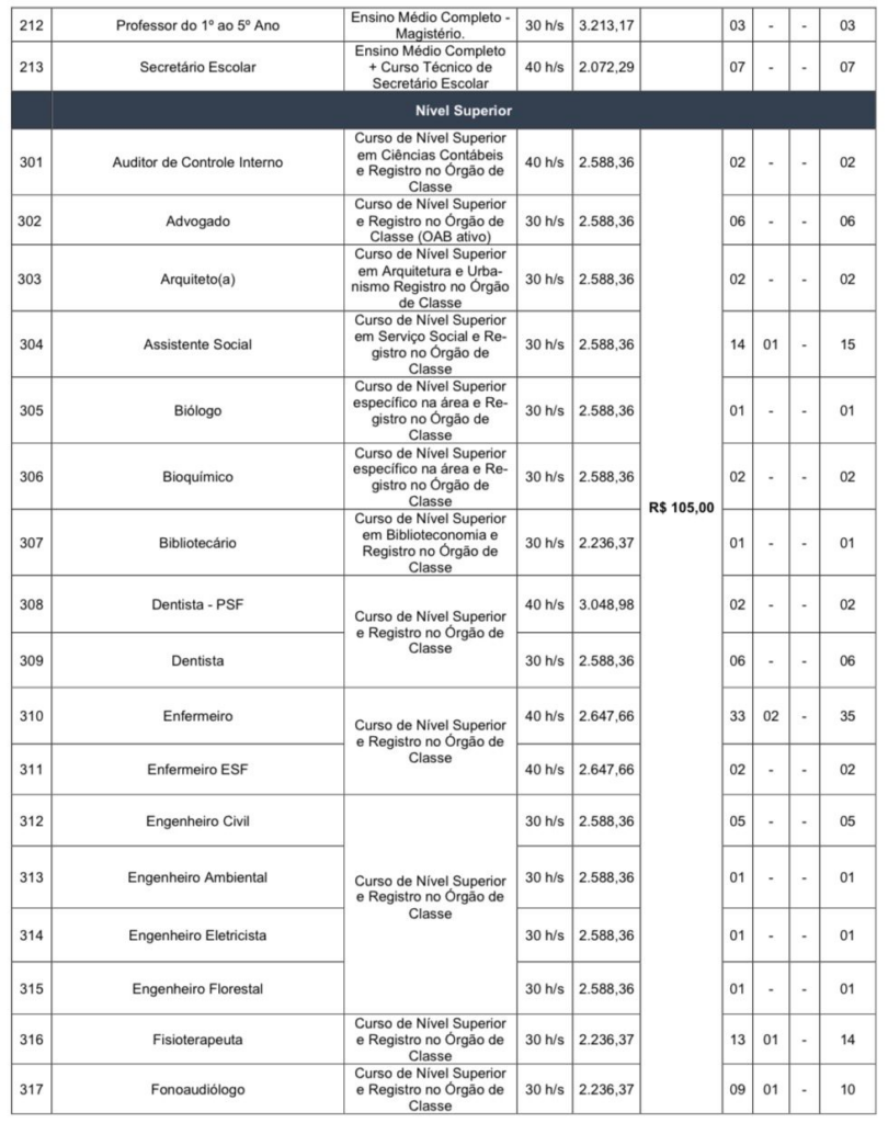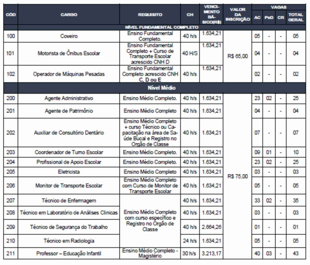 Ainda no dia 02 de maio, também serão aplicadas as provas para os cargos de nível fundamental, sendo eles: Professor do 1º ao 5º ano e Agente Administrativo.