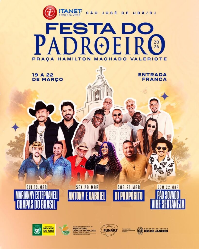 A cidade de São José de Ubá se prepara para viver dias de muita fé, cultura e música com a tradicional Festa do Padroeiro 2026, que será realizada entre os dias 19 e 22 de março, na Praça Hamilton Machado Valeriote. O evento terá entrada franca e promete reunir moradores e visitantes em uma grande celebração.